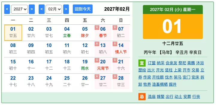 打开日历,就会发现刚刚过去的 2025 年或将来的 2027 年,刚好都是平年,2 月都是拥有完整的 4 个星期。