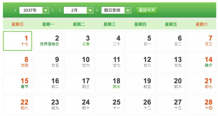 唯一一个特殊的地方出来,还真有一个。那就是 2 月 1 日恰好是周日,如果按照“周日、周一……一直到周六”的顺序排列,整个 2 月的日历呈现恰好方方正正。要出现这种日历排列,只需满足两个简单条件:一是该年是平年;二是 2 月 1 日是星期日。 北京天文馆计算了从 1526 年至 2526 年这一千年间满足这两个条件的年份,有 100 多个,平均不到十年就会出现一次。比如2027年2月1号是周一,也是方方正正的顺序排列。
