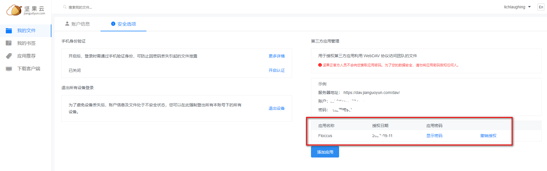 登录成功后,在右上角账户信息——>安全选项下,新增一个第三方应用管理