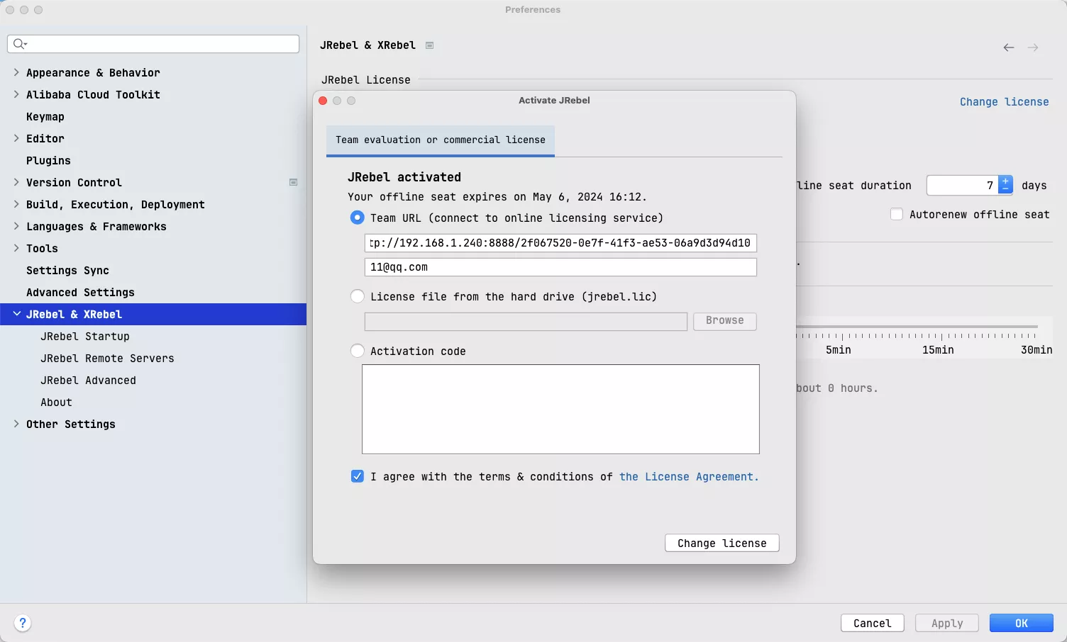 打开IDEA,找到设置,change license 填写上面的激活地址,再加上随便的邮箱地址。激活即可。最后选择离线工作模式就OK叻。