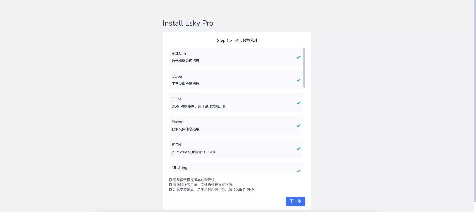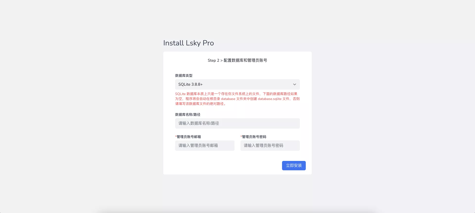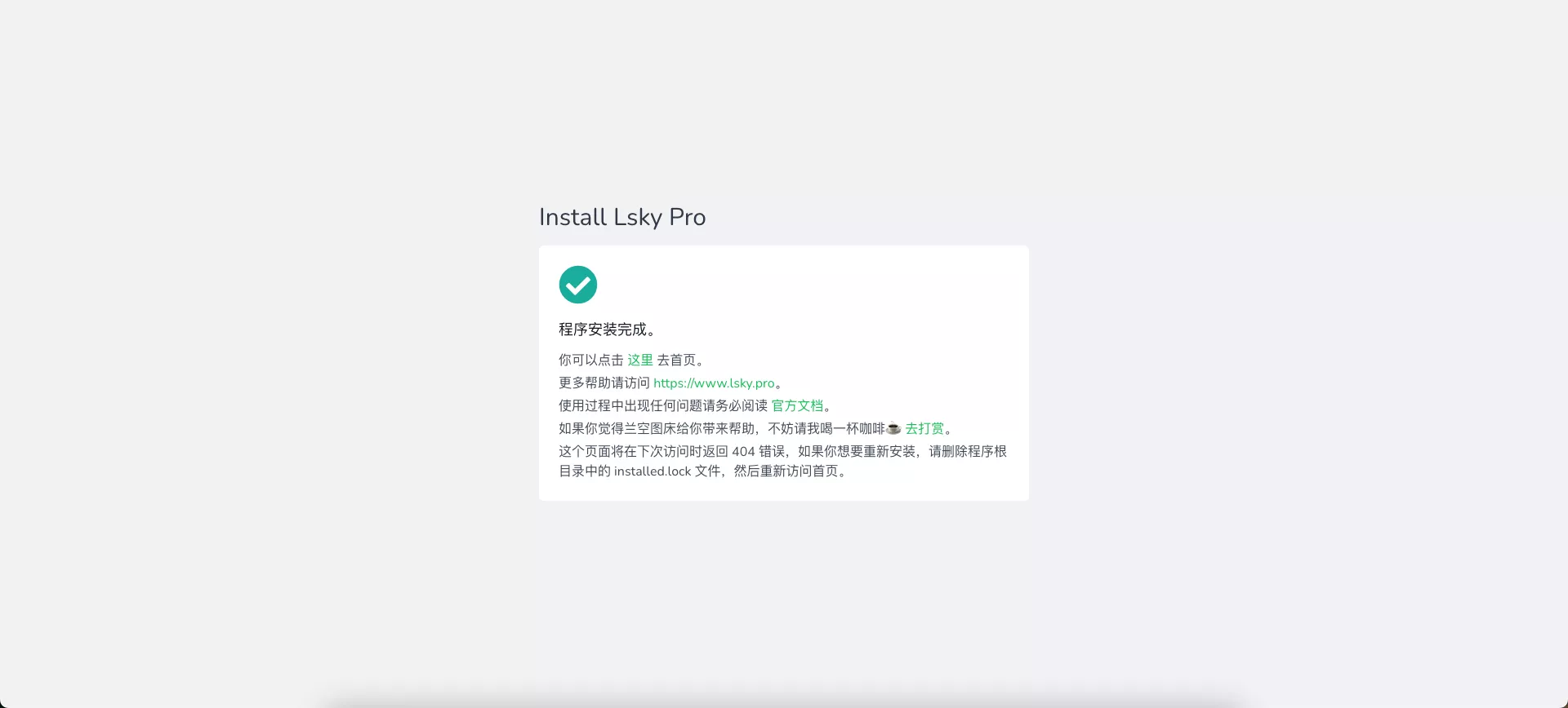 启动后在安装界面选择数据库mysql,数据库地址注意要设置为:lsky-pro-db ,mysql容器的名称!