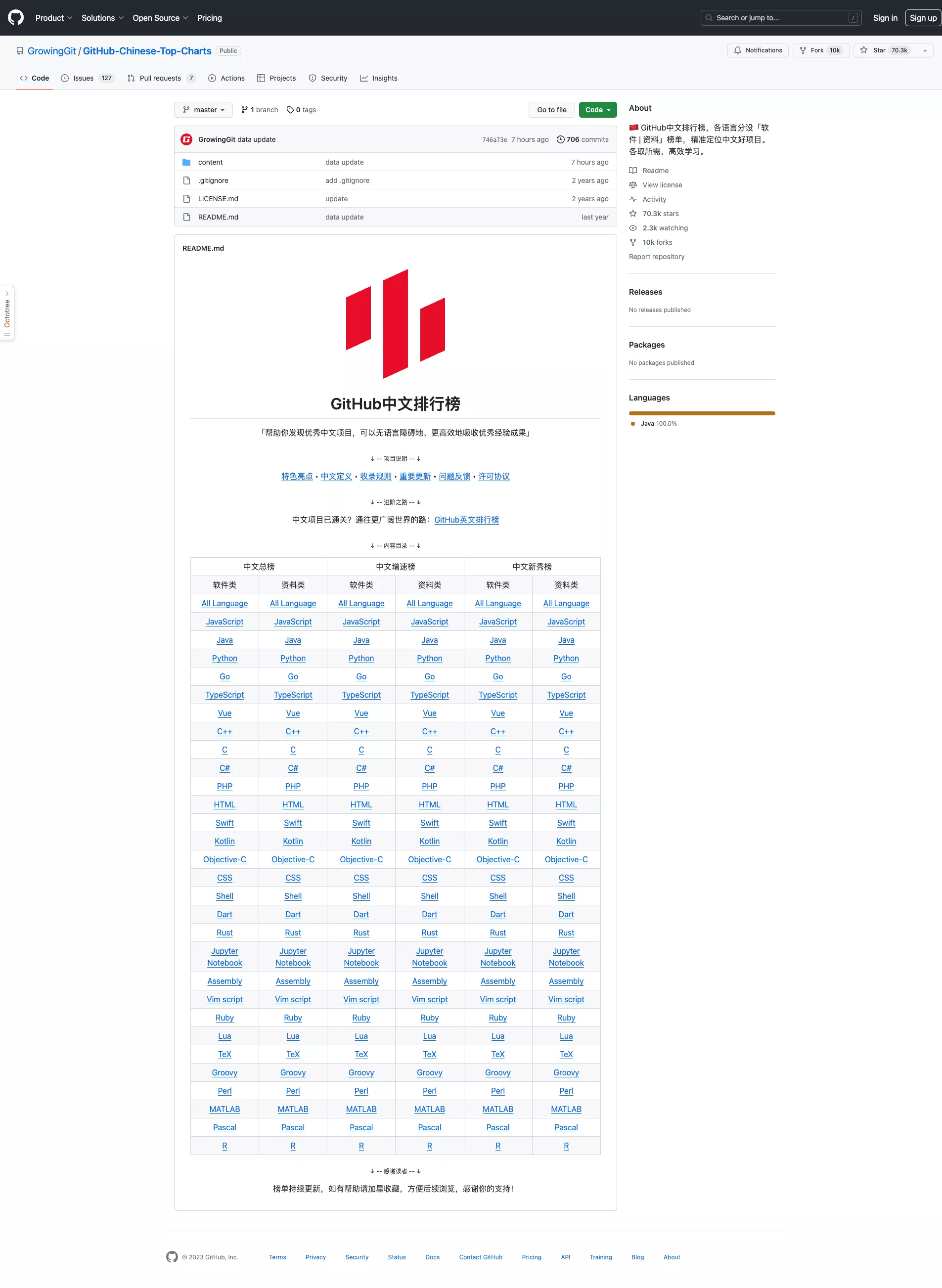 GitHub中文排行榜2023年11月28日 · 阅读需 1 分钟猿1993👨🏻💻🍼奶爸&&程序猿ᴴᵉˡˡᵒ ᵂᵒʳˡᵈ该开源项目整理了中文、或者文档有中文翻译的开源好项目。 https://github.com/GrowingGit/GitHub-Chinese-Top-Charts