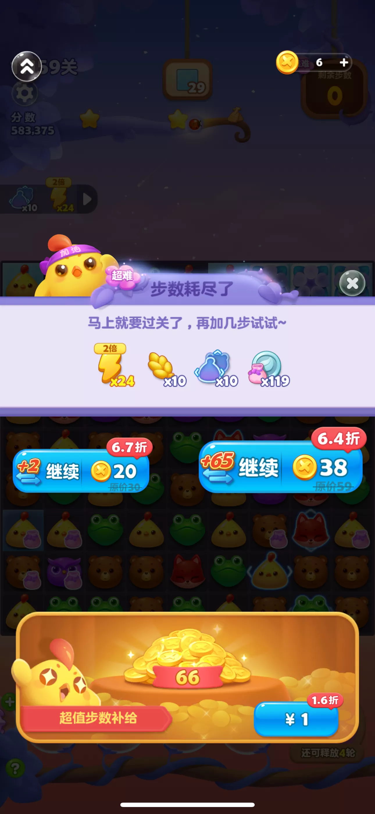 后来新的关卡都解锁了,我这关还没过去。 可能是大部分人都过去不吧,然后官方给了一个小氪金通道,就是在下面给了一个一块钱 66 个金币。38 个金币就可以买增加 65 步,我买了......要不然神仙也过去啊~