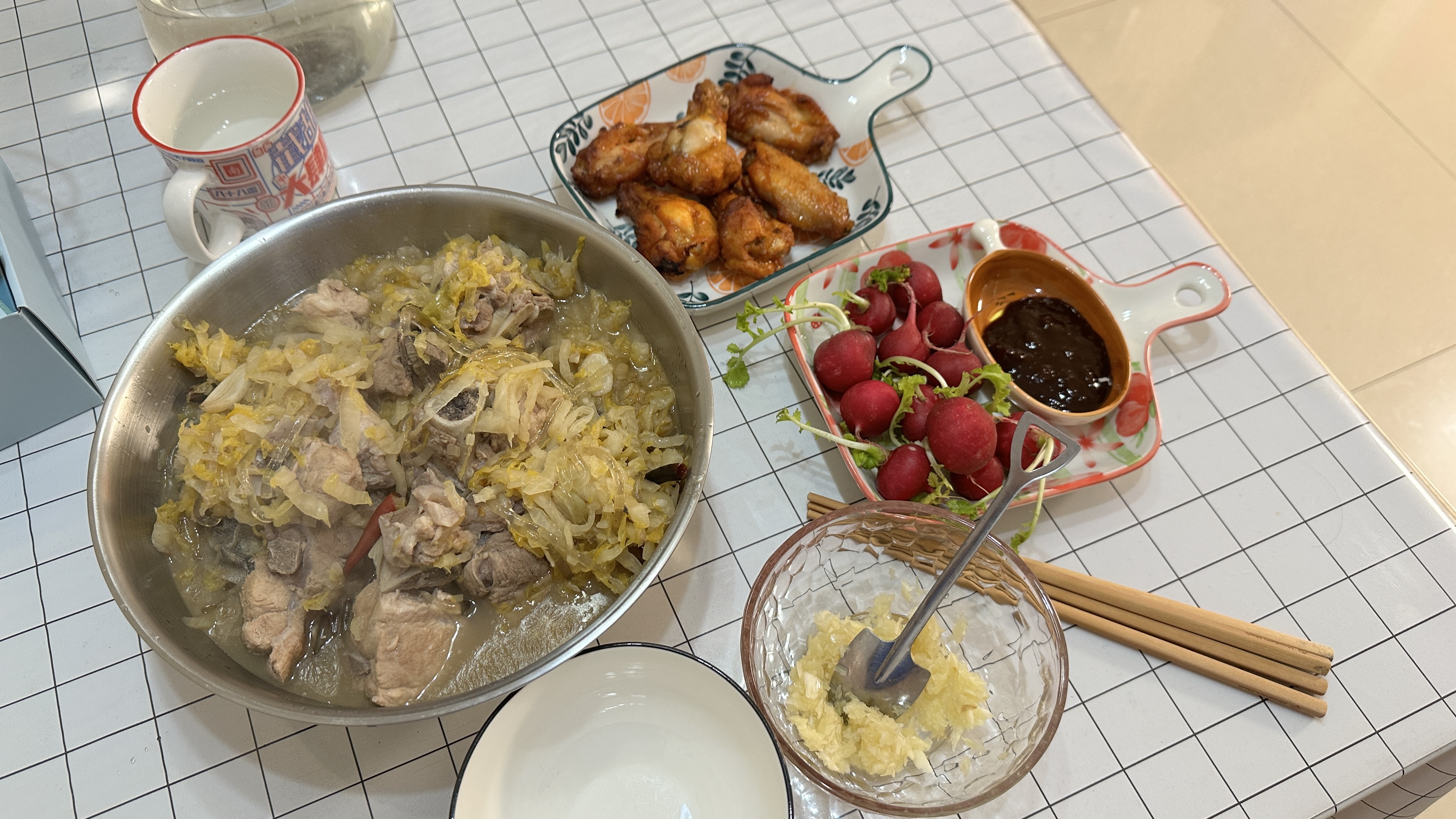 排骨酸菜蘸蒜酱,味道真是绝绝子~ 顺便空气炸锅烤上几个鸡翅,再加上小甜水~~~~