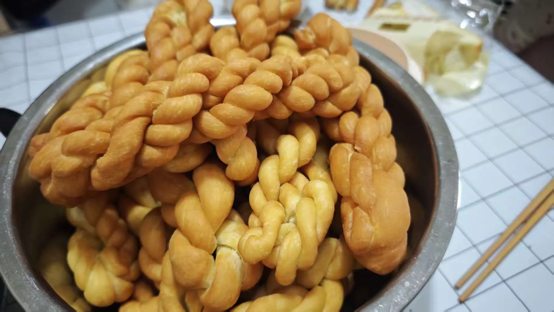 她们都是山西人,除了带宝宝以外,都非常的擅长做面食。馒头、花卷、拉面都不在话下,你就说这个麻花炸的像不像样: