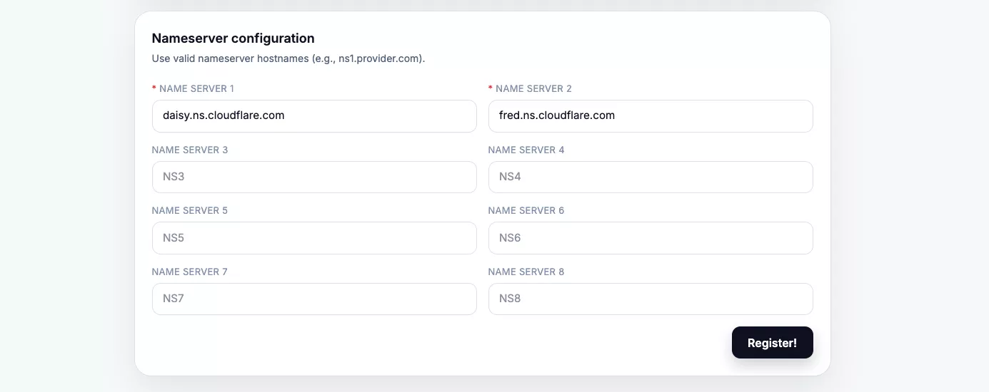 选择Domain Registration,选择一个域名后缀,输入想要的域名,认证的时候将Cloudflare的DNS服务器填写到Nameserver中即可。