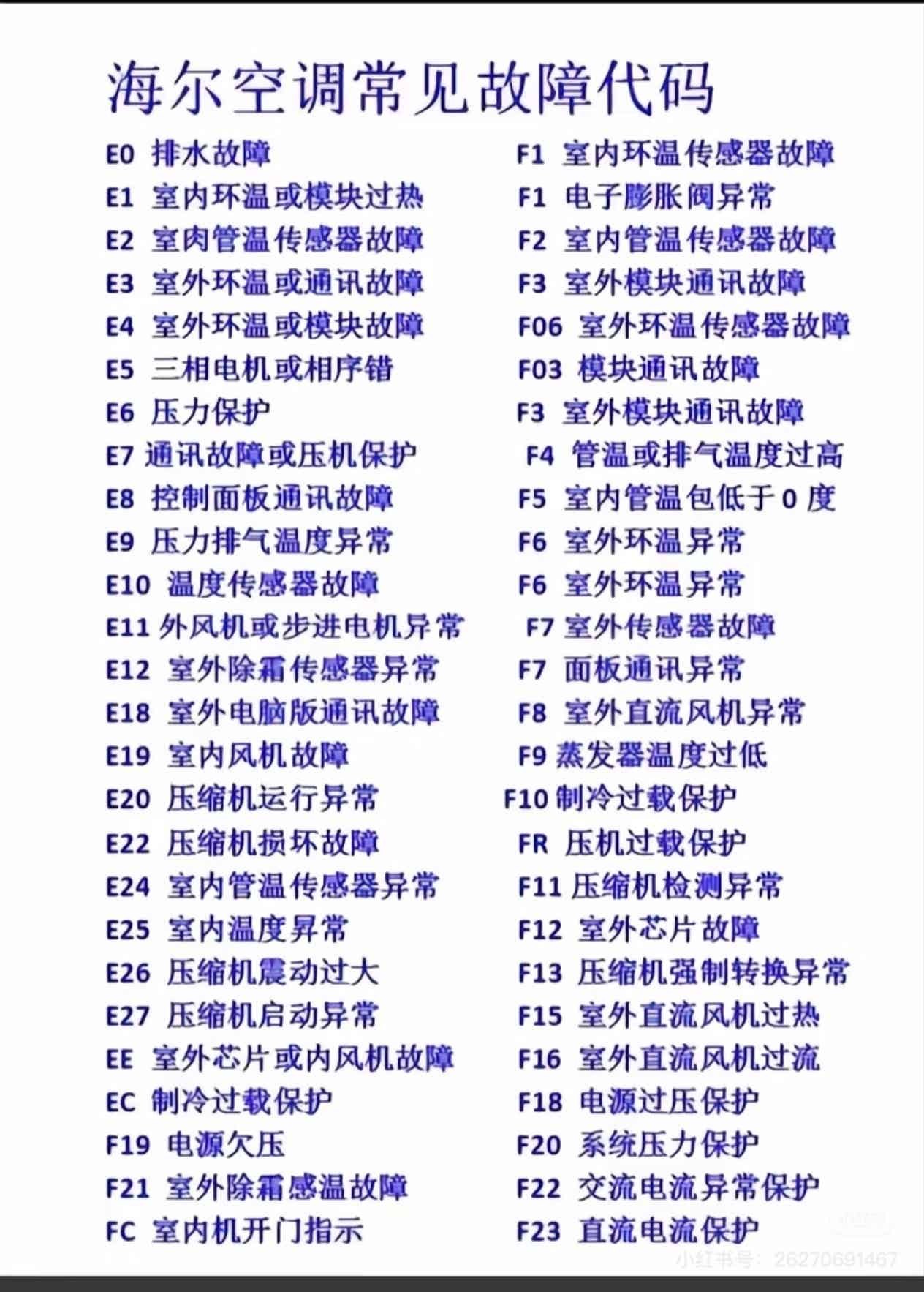 家里次卧的海尔空调坏了,打开就显示错误码 F1,我还去查询了海尔的错误码列表: