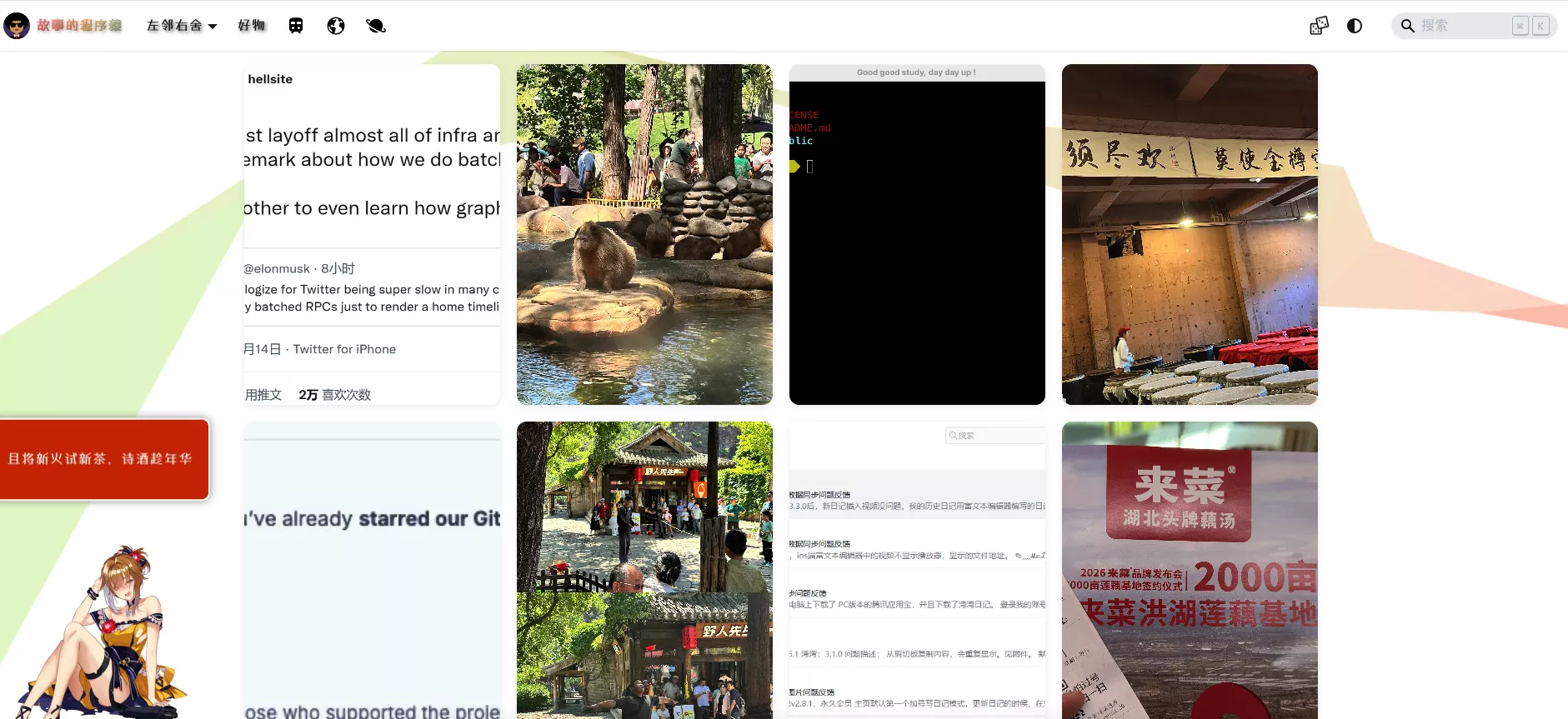 统计了博客文章中的所有插图,瀑布展示,点击每个插图就可以跳转到对应的博客文章。Docusaurus静态站点做这个还有点麻烦,需要对插图的图片名称进行格式化,才能好区分出是博客的插图还是文档的插图。经过一番折腾,也是有个小成果。戳👉
